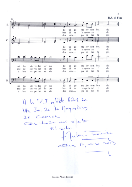 El estreno de esta magnífica creación vocal, se producía al finalizar la misa, momento en que el conjunto de voces se desplazaba hasta el presbiterio, junto a la Señora, para proceder a su interpretación por primera vez.