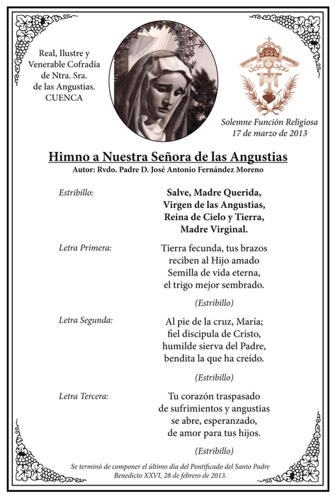 El himno a una Virgen constituye un canto poético de alabanza, fe y devoción, reflejo del amor de todo un pueblo a la madre de Dios. Un canto de entusiasmo y entrega, una manifestación pública de fe en Nuestra Madre, la Madre de Cuenca, María Santísima de las Angustias, la devoción más antigua en nuestra ciudad.