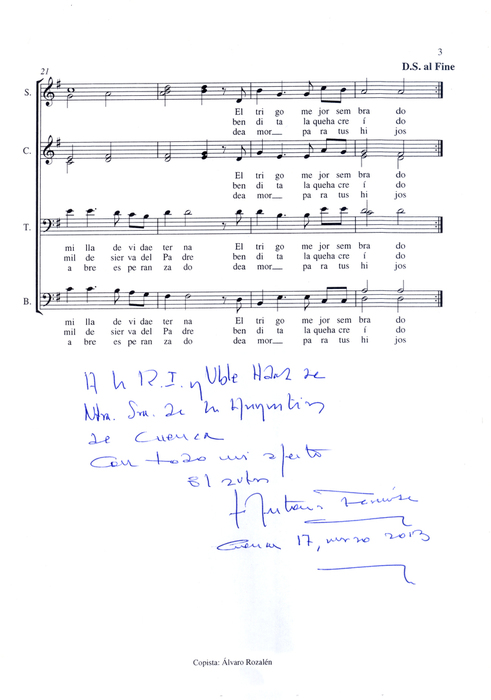 Esta obra ha sido compuesta como himno para el pueblo, coro de voces mixtas y órgano.